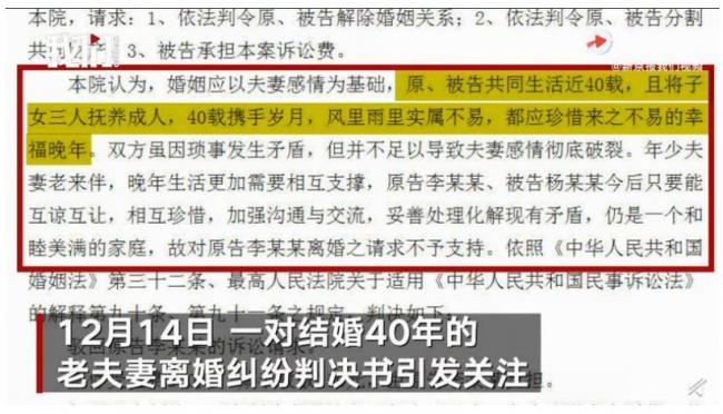 根據本報先前報導,李女婚後才發現丈夫楊男脾氣暴躁易怒,經常打罵自己,考慮到年幼的子女需要照顧,忍氣吞聲40年,才終於鼓起勇氣以夫妻感情破裂為由離婚,但楊男不僅辯稱"年紀大了,開玩笑挺正常"等,法院也以該珍惜"來之不易的幸福晚年"為理由,駁回離婚訴求,女子還得自己負擔案件受理費,引爆輿論沸騰。