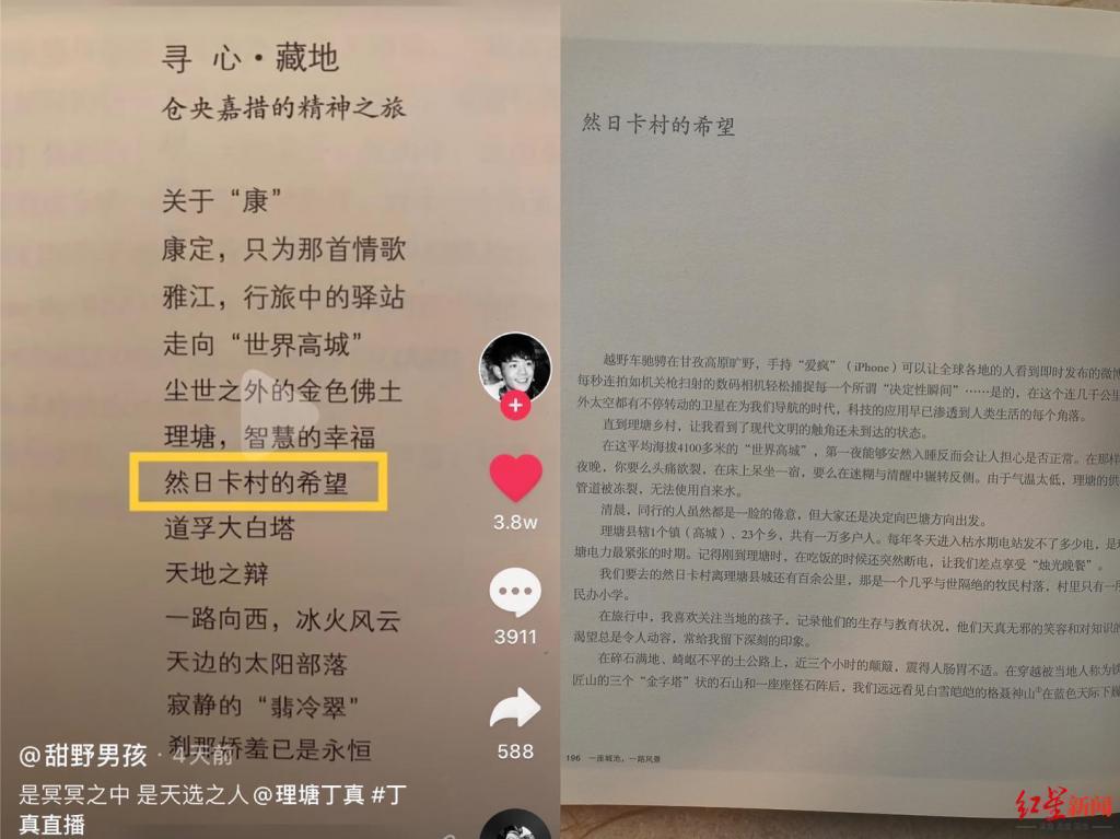 在《尋心 · 藏地》部分 , 壹篇名為 " 然日卡村的希望 " 的文章,寫的是他抵達理塘然日卡村的經歷。1000 多字的文章,以平實的語氣描寫了進入然日卡村的所見所聞。文字旁配以幾張拍攝的照片,除了壹張格聶神山的照片,余下 3 張的篇幅都留給了小朋友,裡面就有神似丁真的那張照片。