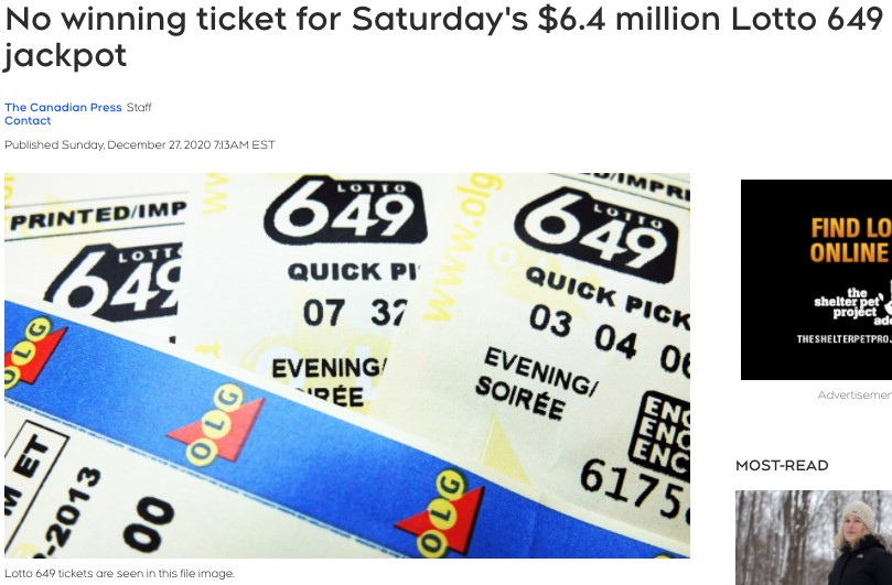 另据CTV最新报道,在上周六晚进行的Lotto 649抽奖活动中,640万元的头奖还没有人中。