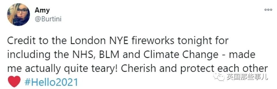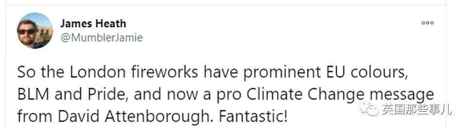 這場煙火秀加入了比以往更多的元素,有些英國人很喜歡:“倫敦煙花秀有顯眼的歐盟顏色,BLM,代表LGBT的彩虹色,現在還有來自David Attenborough關於氣候變化的宣傳。太棒!”