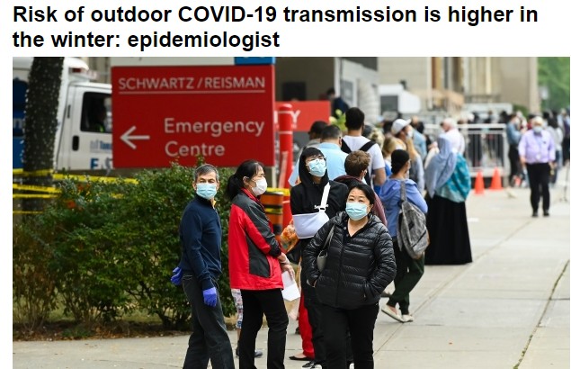 多倫多大學教授科林·弗內斯(Colin Furness)指出,盡管戶外的環境比室內繼續“好得多”,但由於病毒的特殊傳播方式,冬季戶外可能更易傳播病毒!