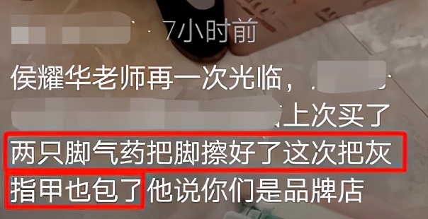 不難看出,拍攝者應該是足療店的員工,但他卻沒怎麼給侯耀華“留情面”,配文直接曝光了他有腳氣、灰指甲,大大咧咧地泄露了顧客的個人隱私。
