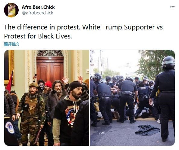 当地时间1月6日,特朗普支持者暴力冲击国会大厦,导致现场一片混乱。不少媒体和社交媒体用户注意到,现场警方在处理这场骚乱时的行动,与之前处理“黑人的命也是命”运动时有着很大的区别。