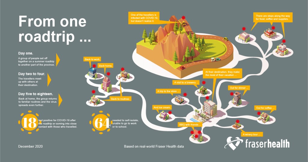 菲沙衛生當局今天公布壹例病例如何傳播的實例,以警告其他旅行危險性。這壹組人到BC省外旅行,第贰天在目的地又和另外4人匯合,第伍天這組人返回家庭和工作崗位,進壹步傳播新冠病毒,至少18人感染。