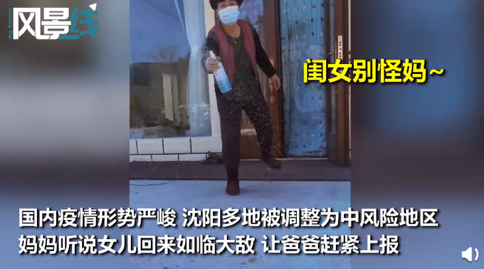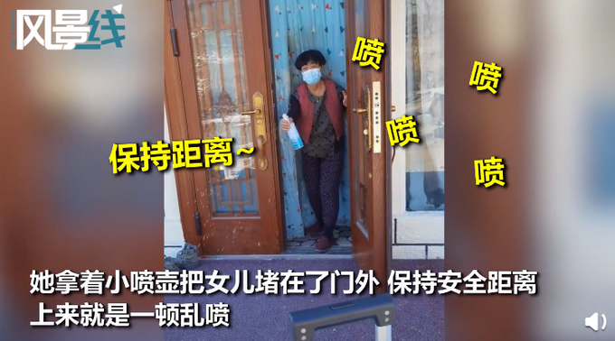 近日,一名在辽宁沈阳就读的大学生放寒假回到家,拿着核酸检测的结果,但还是遭到母亲大人的无情“嫌弃”。她拿着小喷壶把女儿堵在了门外,保持安全距离,上来就是一顿喷。目前,沈阳多地被调整为中风险区,妈妈听说女儿回来让爸爸赶紧上报。