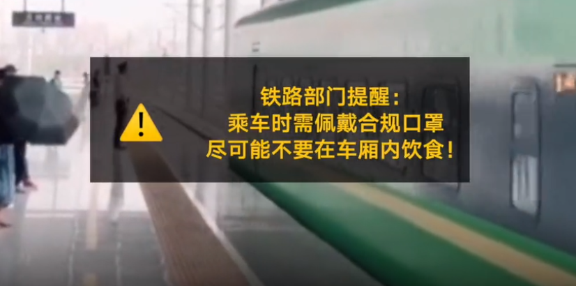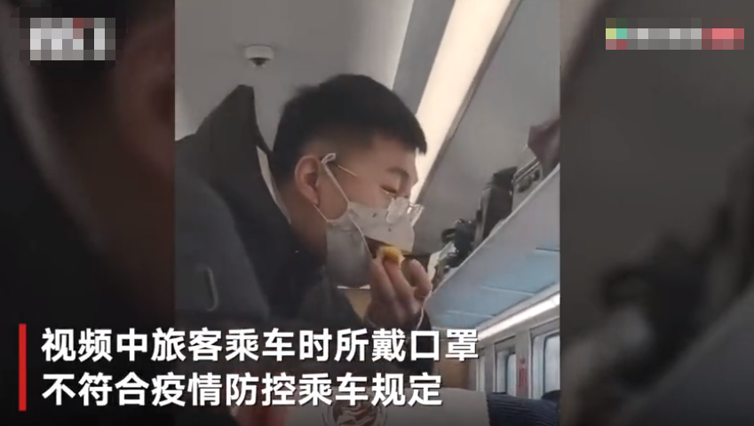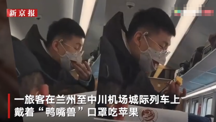 1月12日,壹旅客在蘭州至中川機場城際列車上,戴著“鴨嘴獸”口罩吃蘋果。新京報記者從中鐵蘭州局蘭州客運段獲悉,當日並未有乘務員發現該情況,視頻中旅客乘車時所戴口罩不符合疫情防控乘車規定,如乘務員發現後,會提示其更換口罩或發放應急口罩,車廂內雖未明確禁止乘客飲食,但乘務員也會及時提醒。鐵路部門提醒:乘車時需佩戴合規口罩,盡可能不要在車廂內飲食!