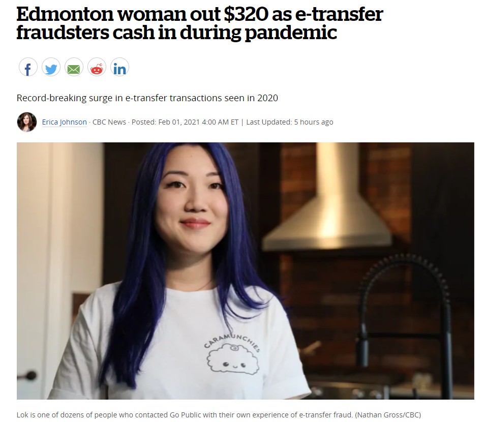 来自埃德蒙顿的Alysia Lok(音译),经营自创的零食品牌,她的客人可以通过电子转账付款。但因网络黑客入侵,导致她的电子转账(e-transfer)钱款被盗取。