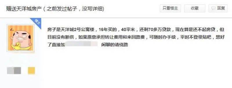 黃先生在網上發布的“贈送天洋城房產”帖子截圖