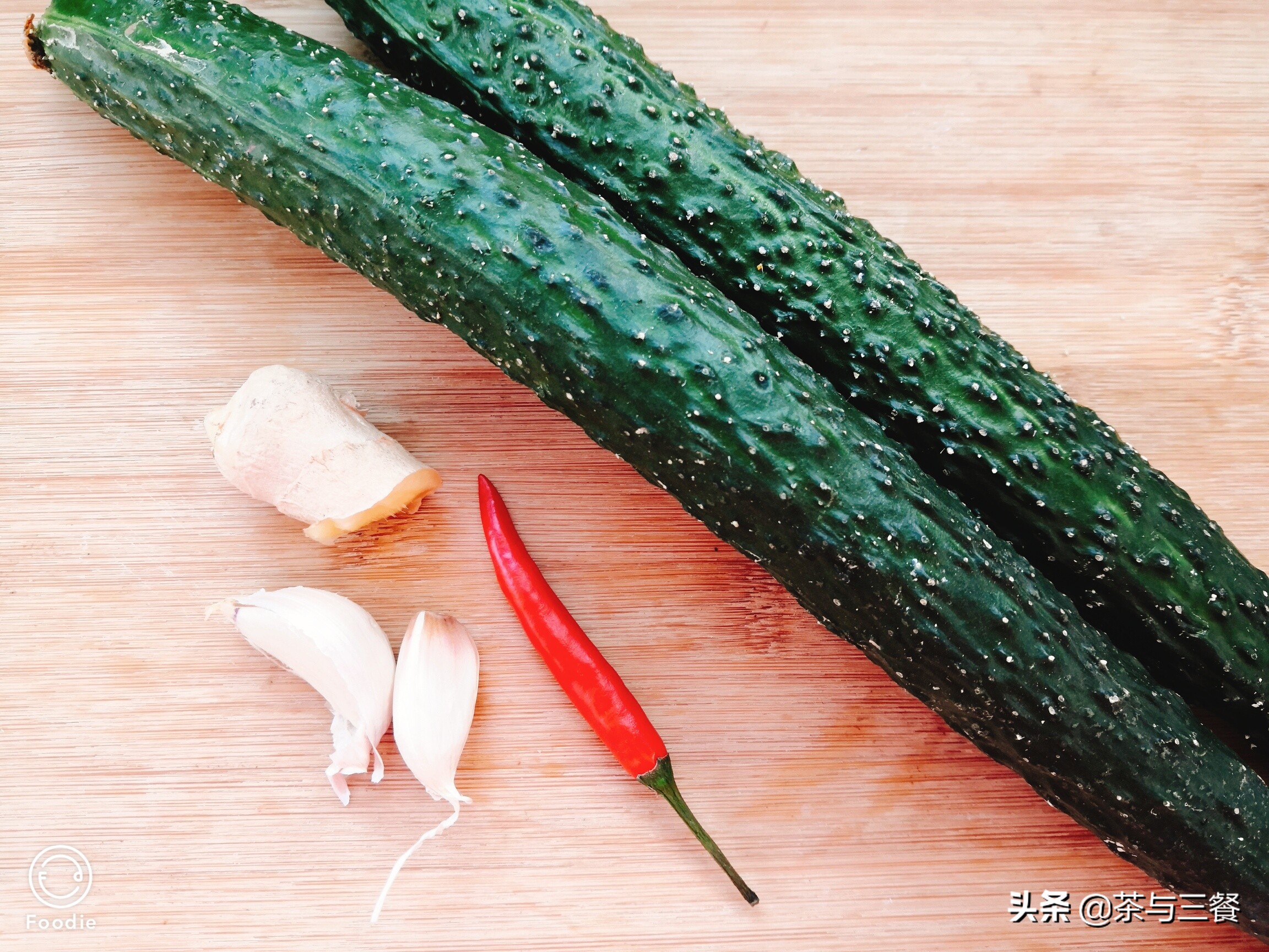 准備材料:黃瓜2根,姜1塊,蒜2瓣,紅米椒1只。