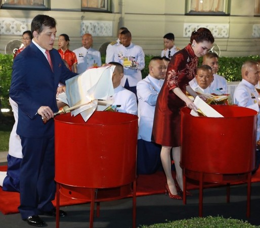 2月12日晚上9點08分,泰王瓦吉拉隆功(Maha Vajiralongkorn)與王後蘇堤達(Suthida)、公主帕差拉吉帝雅帕(Bajrakitiyabha)以及貴妃詩妮娜(Sineenat)壹同在曼谷亮相,進行新春祭祀。