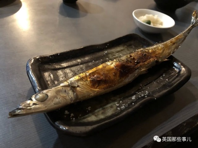 有烤秋刀鱼、鱼肉块、花蛤汤、凉拌海带,