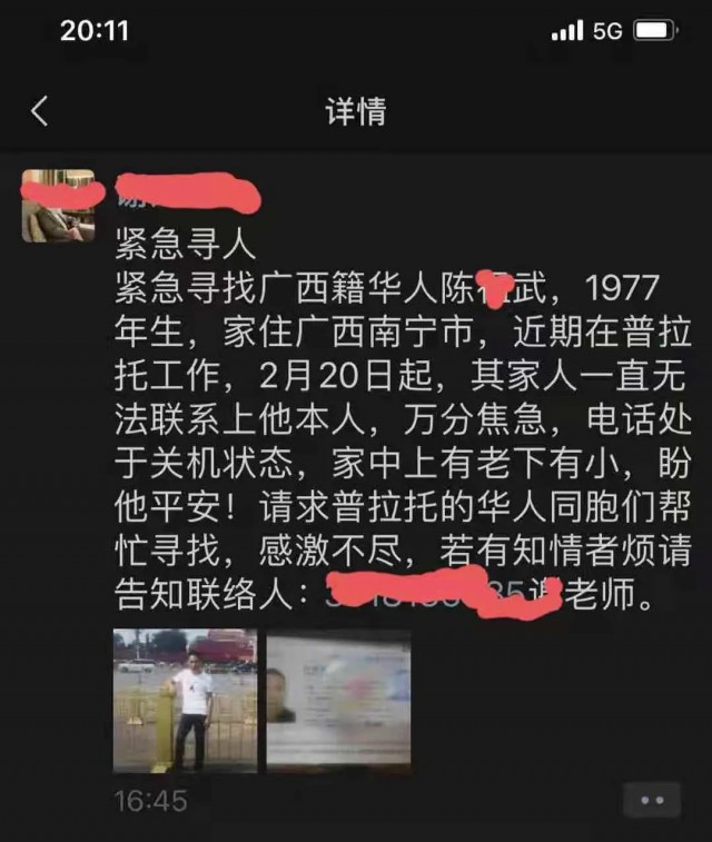 今天,旅居羅馬的謝先生在朋友圈和華人論壇上發了壹則尋人啟事(上圖),大意是:緊急尋找廣西籍華人陳X武,1977年生,家住廣西南寧,近期在意大利普拉托工作,2月20日起,其家人壹直無法聯系上他,萬分焦急,電話處於關機狀態,家中上有老下有小,盼他平安!請求普拉托的華人幫忙尋找,感激不盡……