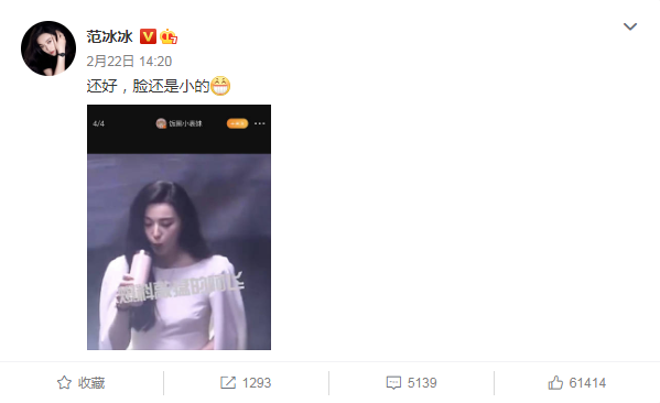 不過,范冰冰很快就用自黑的方式澄清了懷孕壹說,她在微博曬出自己的大肚照,並配文稱:“還好,臉還是小的”,輕松回應了懷孕傳聞。