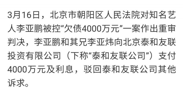 3月17日,有媒體報道稱演員李亞鵬此前欠債4000萬元的案子重審宣判,這壹消息壹經曝光就引發了網友的感慨,利息太高了。