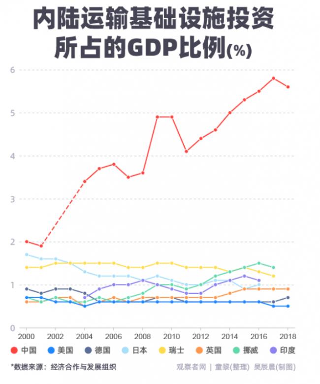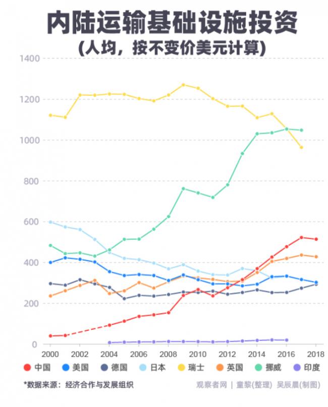 即便如此,美國基建支出占GDP的比例還是呈下降趨勢。以內陸運輸基礎設施投資或細化至鐵路運輸基礎設施投資為例,美國漸漸落後於他的壹些發達國家“好伙伴”,更別提在基建上不斷發力的中國了。