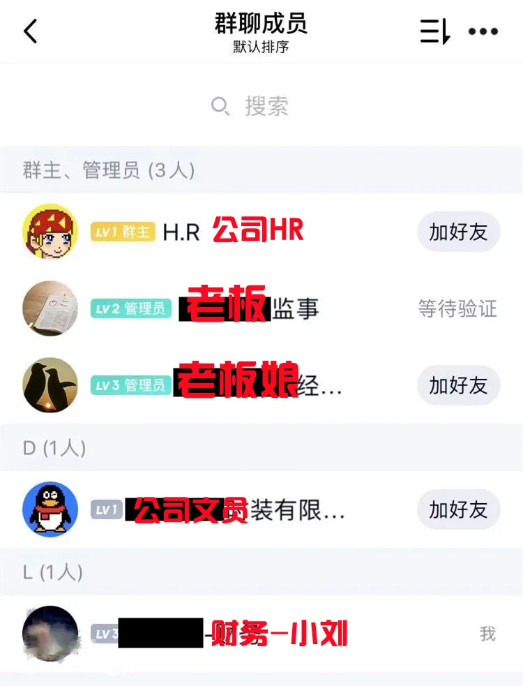 小劉進群後,看到“老板”、“老板娘”、“公司HR”還有“公司文員”都在群內。