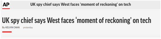 據美聯社報道,當地時間4月23日,英國間諜機構——英國政府通訊總部(GCHQ)負責人傑裡米·弗萊明警告稱,如果西方國家不采取行動應對威脅,就有可能面臨將壹些對互聯網安全和經濟繁榮至關重要的技術控制權拱手讓給中國和俄羅斯等國的風險。