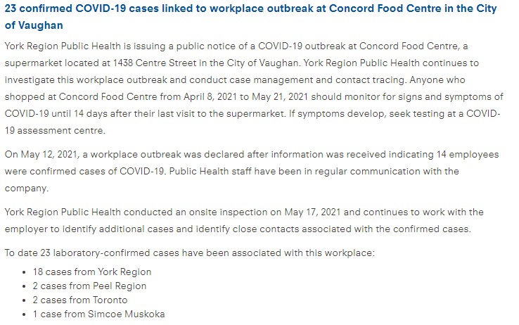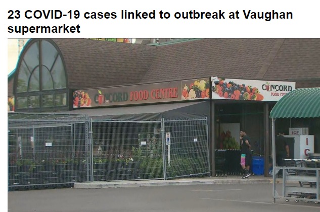 原因是,根據約克地區公共衛生部門的數據,在Thornhill附近的Dufferin和Centre街的Concord食品中心,有 23 例 COVID-19 病例爆發。