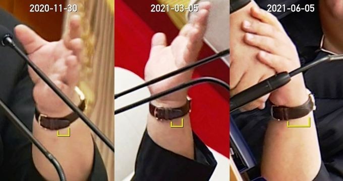 另外,美國專門分析北韓時事的媒體《NK News》比對金正恩於去年11月、今年3月、6月的相片,發現金正恩體重明顯下降,且手腕的粗度逐漸變細,而其配戴的瑞士Iwc萬國表的表帶,也被發現系得越來越緊。- 新聞來源於其它媒體,內容不代表本站立場!