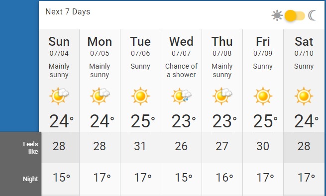 加拿大环境部预测大温未来一周,最高温度25度至23度之间,体感最高有31度。不过,入夜后最低温度都抵于20度。