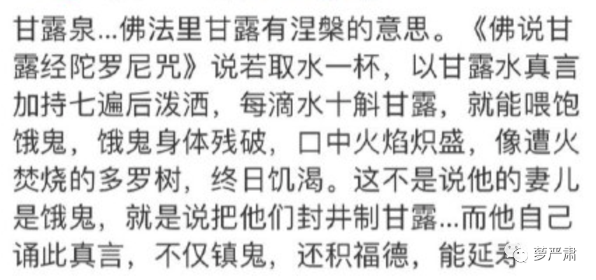2.不久後“甘露泉”叁個字出現了全新的解釋,說甘露在佛法裡是涅盤的意思,甘露能喂飽惡鬼,造個甘露泉就是把死者都封在井內……(哈?我還以為如果“甘露”在佛法裡是涅盤意思的話,甘露泉就是保佑他們涅盤重生啊?)