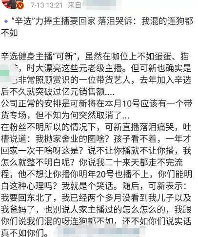 7月13日,有網友曬出網紅“可新”的壹段直播片段,可新公然吐槽辛選,稱自己混得連狗都不如。