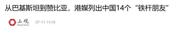 香港《南華早報》7月10日的壹篇文章《中國的“鐵杆”朋友多了起來》稱,在過去,中國外交聲明的英文版本中,比較少使用“鐵杆(ironclad)”壹詞形容中國和他國的密切關系,如今,這壹詞已經用在了拾幾個國家身上。