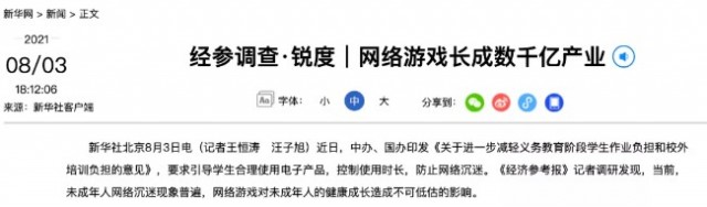 新华社主办的《经济参考报》发出一篇《网游对未成年人影响触目惊心 “精神鸦片”竟长成数千亿产业》的报道,轰动金融圈。文章矛头直指腾讯、网易两大游戏巨头,还特别点名了国民游戏《王者荣耀》,并称“任何一个产业、一项竞技都不能以毁掉一代人的方式来发展。”中午文章一度被撤下,就在市场以为警报解除时,晚间文章又神奇“复活”,只是标题和内文删除了“电子毒品”、“精神鸦片”等词。