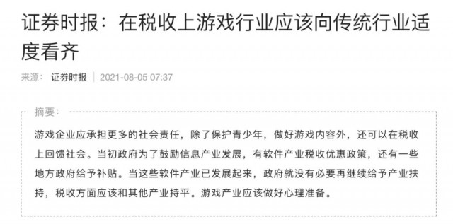 8月5日,人民日报主办的《证券时报》发文表示,游戏产业要做好心理准备,政府没必要再给予税收优惠。