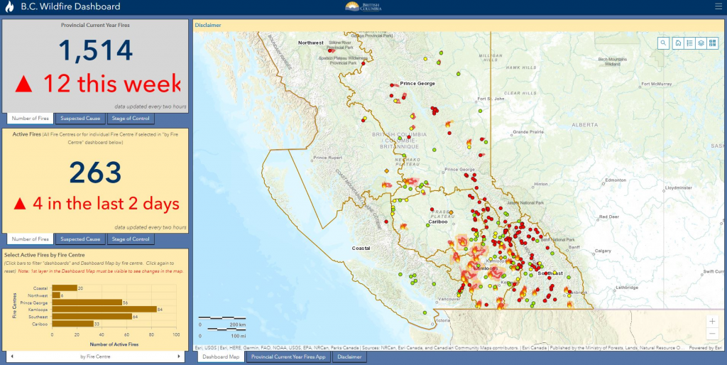 目前,BC 省有 260 多處野火在燃燒,大部分火災發生在甘露市附近和東南部。