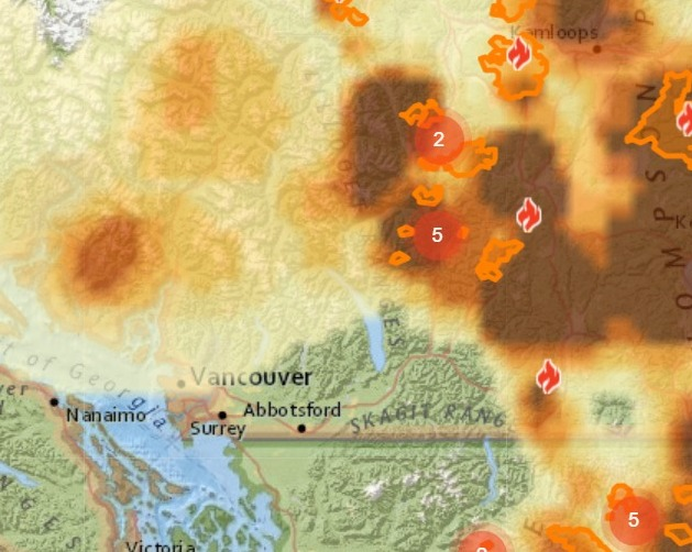 目前,BC省山火煙霧最嚴重的地區仍位於BC省南部內陸地區。