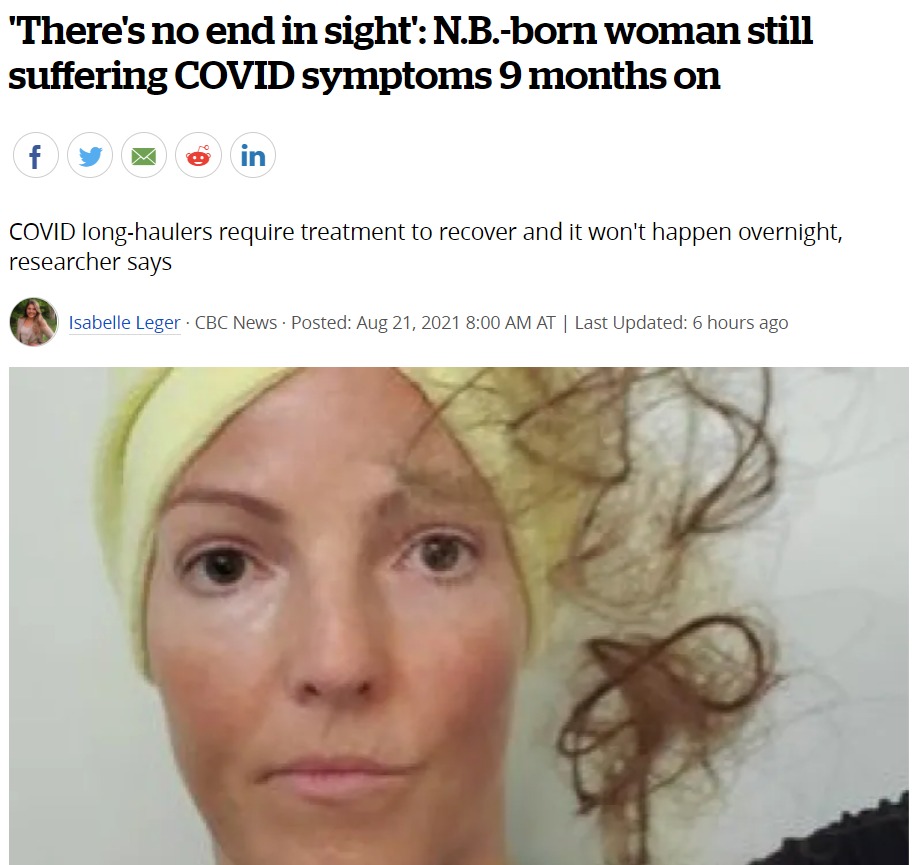 加拿大壹名年輕女子在感染病毒9個月後仍有後遺症,她的頭發幾乎掉光了!她稱這場病看不到盡頭......