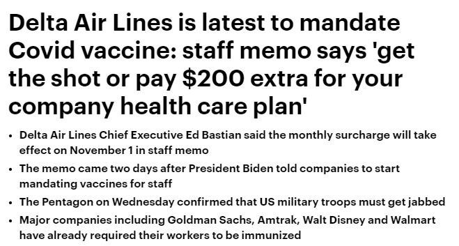 达美航空的竞争对手联合航空公司、美国铁路公司、沃尔特迪斯尼和沃尔玛等大公司也已经要求他们的工人接种疫苗。