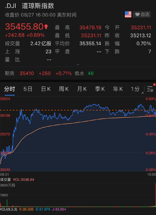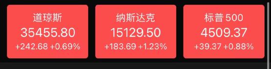 截至收盤,道瓊斯指數漲 0.69%,漲超 240 點,報 35,455.80 點;標普 500 指數漲 0.88%,報 4,509.37 點,創新高;納斯達克綜合指數漲 1.23%,報 15,129.50 點,創新高。