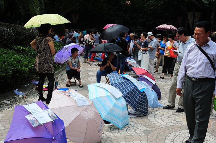 ▲ 2014年9月27日,上海人民公園相親角內人頭攢動,父母將子女的征婚信息貼在雨傘上。? 圖蟲