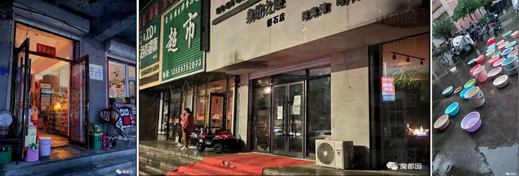 左圖:吉林網民上傳的圖片顯示,當地店鋪因缺電,改用蠟燭照明。 中圖:入夜後,許多店鋪提前停業。 右圖:居民大樓停水,居民用家裡的塑料盆接雨滴。(喬龍提供)