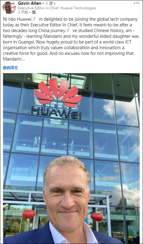 BBC(英国广播公司)新闻前高管加文·艾伦(Gavin Allen)日前在领英宣布自己已入职华为,并发布了在华为公司门口的自拍照。
