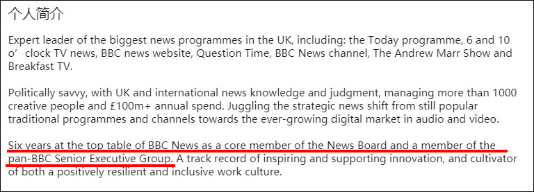 他在简介中说,作为新闻委员会的核心成员和泛BBC高级执行集团的成员,他在BBC高层任职了6年。