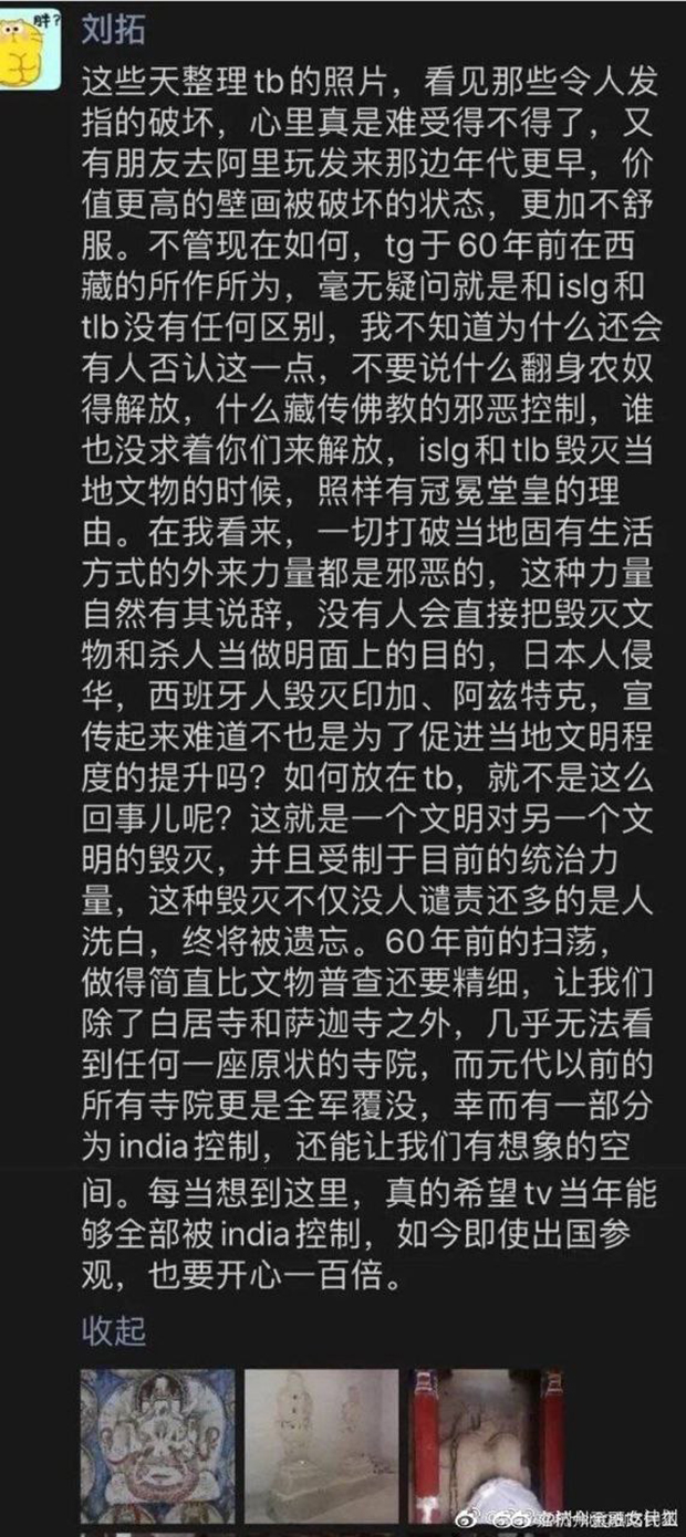 網上廣為流傳的壹張圖片顯示,劉拓在微信朋友圈中表示,中共於60年前在西藏的所作所為,與伊斯蘭國和塔利班沒有區別,並說中共對西藏文物的掃蕩,導致“我們除了白居寺和薩迦寺之外,幾乎無法看到任何壹座原狀的寺院,而元代以前的所有寺院更是全軍覆沒”。這張圖片還顯示,他希望西藏當年能全部被印度控制,從而能夠保存住文物。