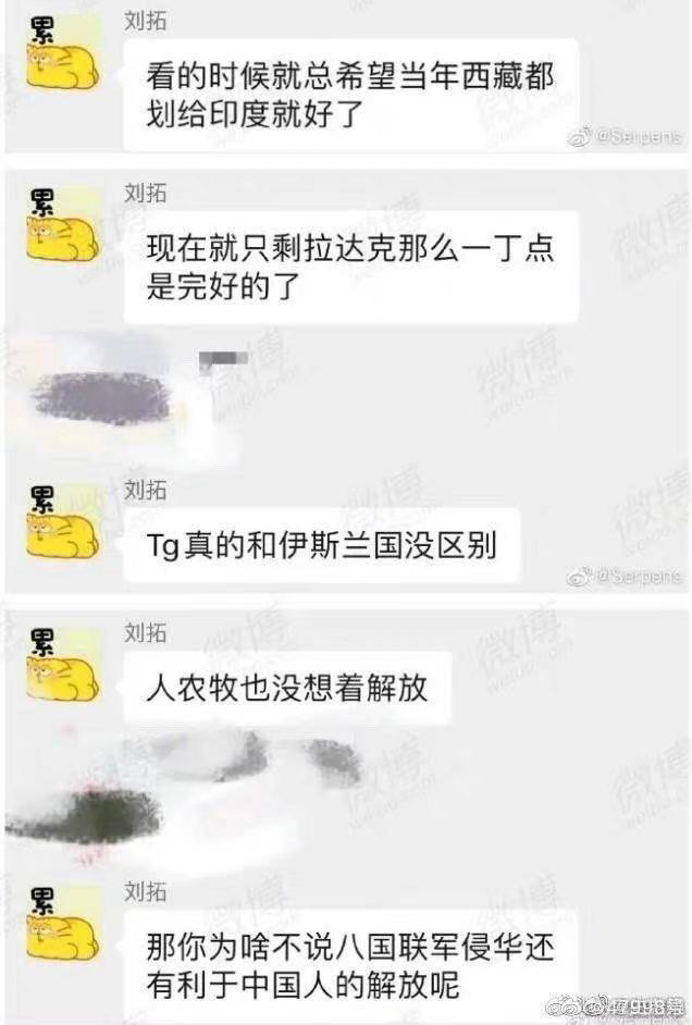 在網上流傳的另壹張圖片中,則顯示劉拓在微信聊天中表示:“希望當年西藏都劃給印度就好了。”