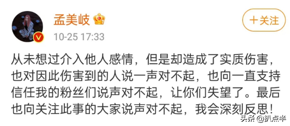 她先後經歷了經紀公司出面否認、陳令韜留遺書承認出軌,再到她本人出面道歉幾個過程,基本上已經可以判斷:孟美岐自己把自己的演藝事業毀掉了。