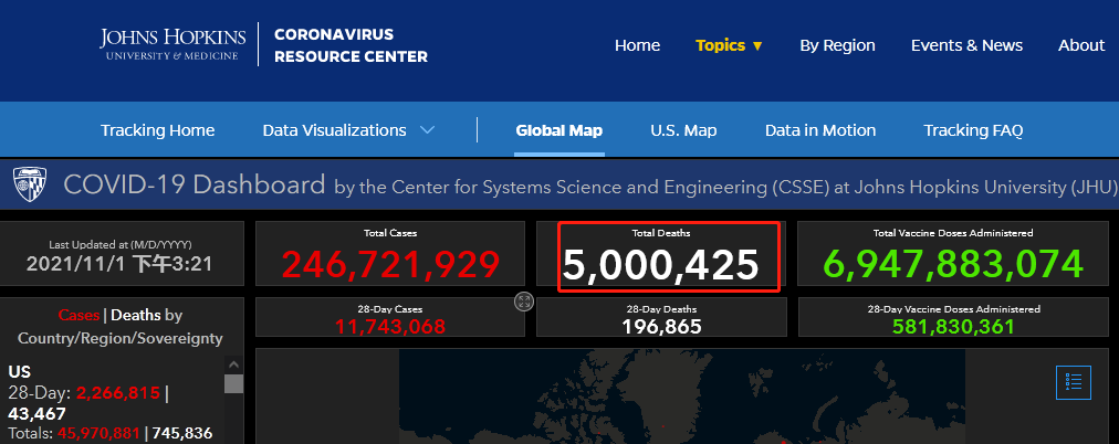 据美国约翰·霍普金斯大学实时数据显示,截至北京时间11月1日16时50分,全球因新冠病毒累计死亡人数超过500万例,累计确诊人数达246721929。其中美国累计死亡人数745836例。