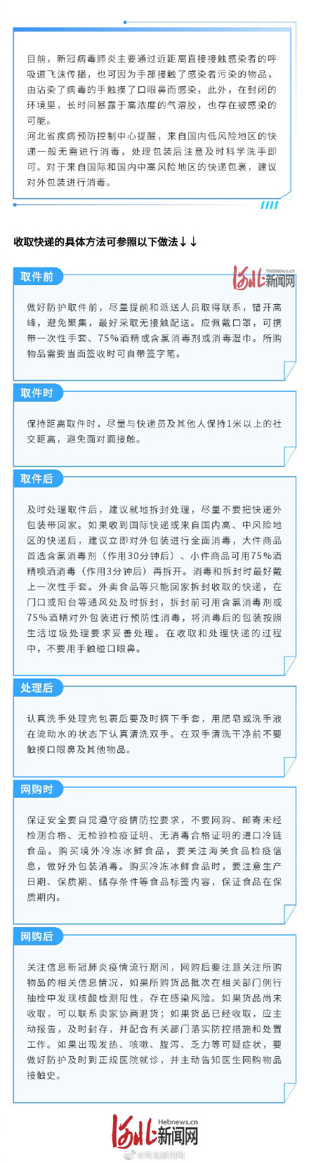 中国疾控中心消毒学专家张流波建议:①中高风险地区暂不收发快递,快递员做好健康监测;②快递转运过程中要做好保护,同时进行消毒;③收快递时做好防护,快递包装尽量不带到家中;④处理完快递后做好手部卫生工作。收取快递的具体方法可参照以下做法