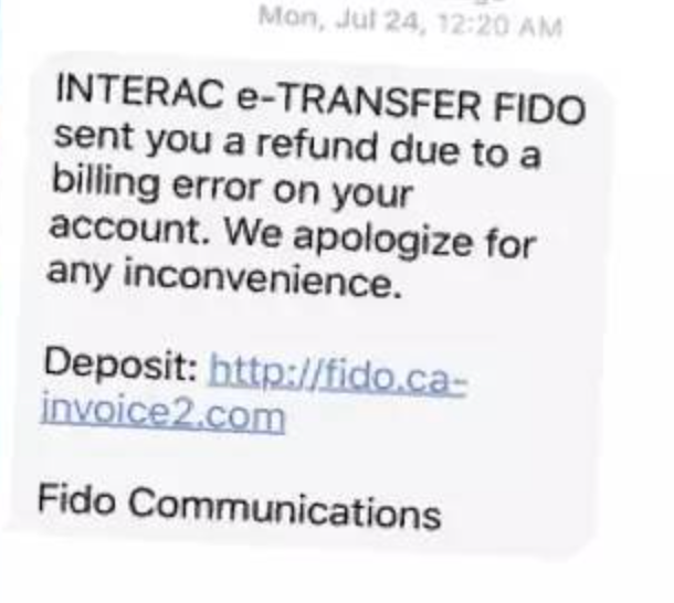 壹名L姓市民在社交媒體發帖稱,收到疑似由Fido發出的短信,通知收信人上月的帳單有壹筆67.82元的退款,但退款以電子轉帳(Interac E-Transfer)的方式送出,收信人需要選擇自己所屬銀行戶口領取,並提供鏈接。