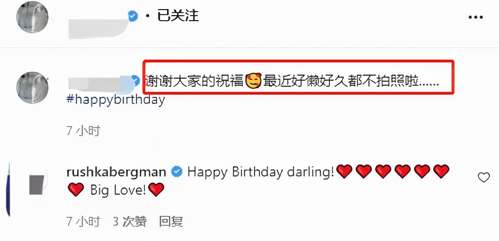 對於大家送上的生日祝福,章澤天在留言中也表示了感謝,稱自己最近好懶所以都沒拍照了↓