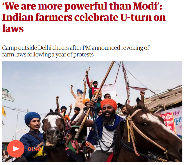 莫迪宣布撤回叁項新農業法 《衛報》視頻截圖