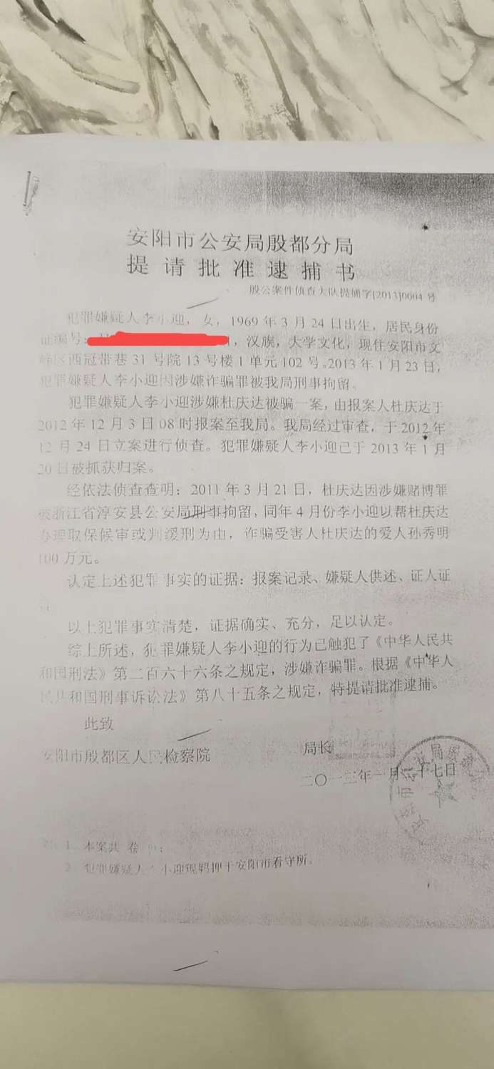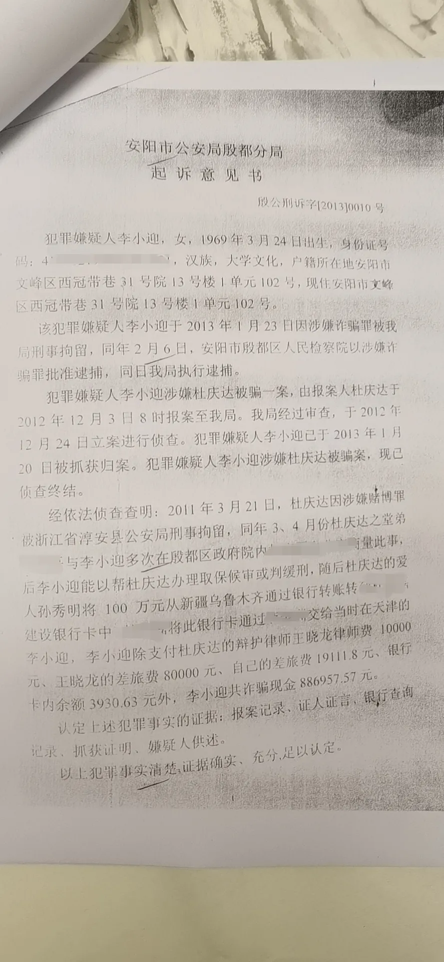 大家好,我叫杜庆达是李小迎诈骗案的受害人。最近安阳“狗咬老人”事件成为网上热点,李小迎成为了网络的焦点。我也是无意间上网看到网上牵狗的李小迎就是8年前诈骗百万的李小迎。河南省安阳市人李小迎以为我办事为由,隐蔽事实真相骗了我壹佰万元现金,在多次协商未果的情况下,向公安机关报案。