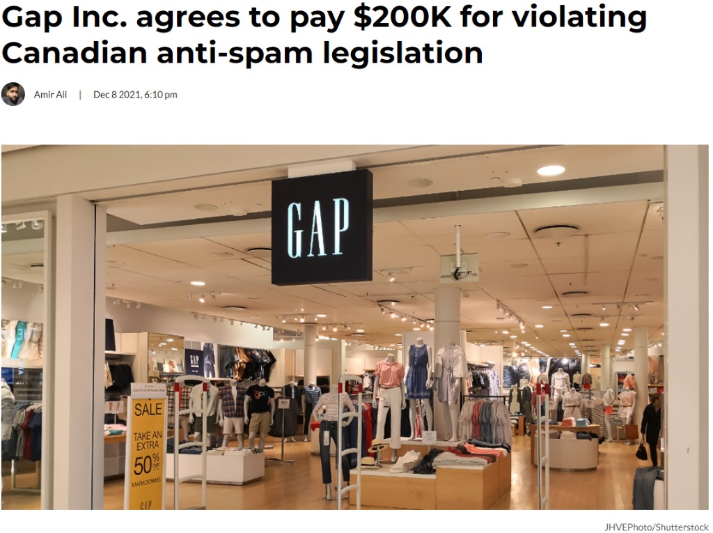 根據加拿大廣播電視和電信委員會 (CRTC) 的聲明,2018年1月至2021年8月期間GAP違反了加拿大反垃圾郵件法(Canadian anti-spam legislation)。