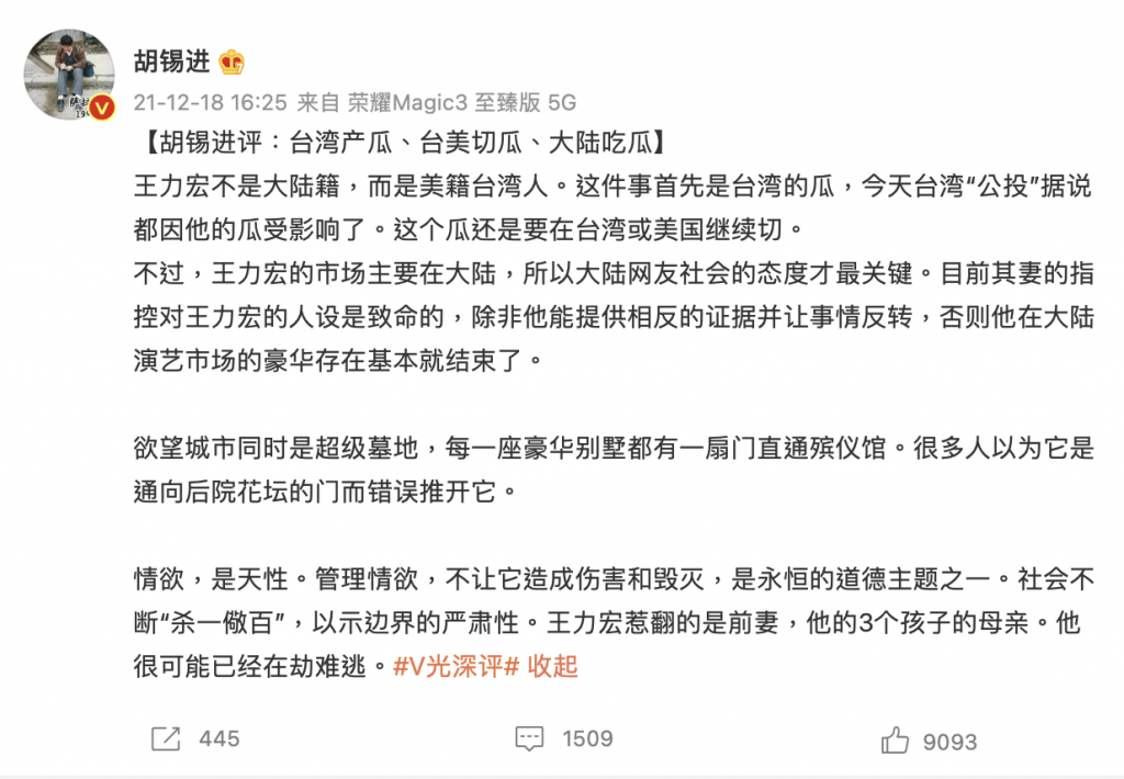 現為《環球時報》特約評論員胡錫進,發表壹則題為《台灣產瓜、台美切瓜、大陸吃瓜》的評論表示,王力宏不是大陸籍,而是美籍台灣人。這件事首先是台灣的瓜,今天台灣「公投」據說都因他的瓜受影響了。這個瓜還是要在台灣或美國繼續切。