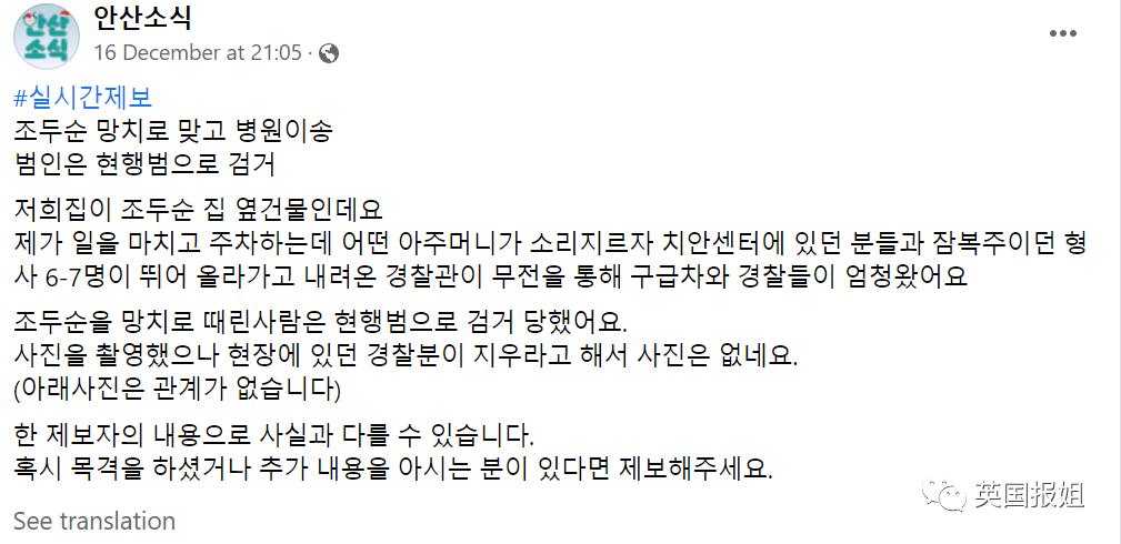 隨後,和他住在壹起的的妻子跑出來大喊人幫忙,朝著贰拾米外的治安亭求助。(因為這裡是趙斗淳居住地,所以附近警力非常充足)